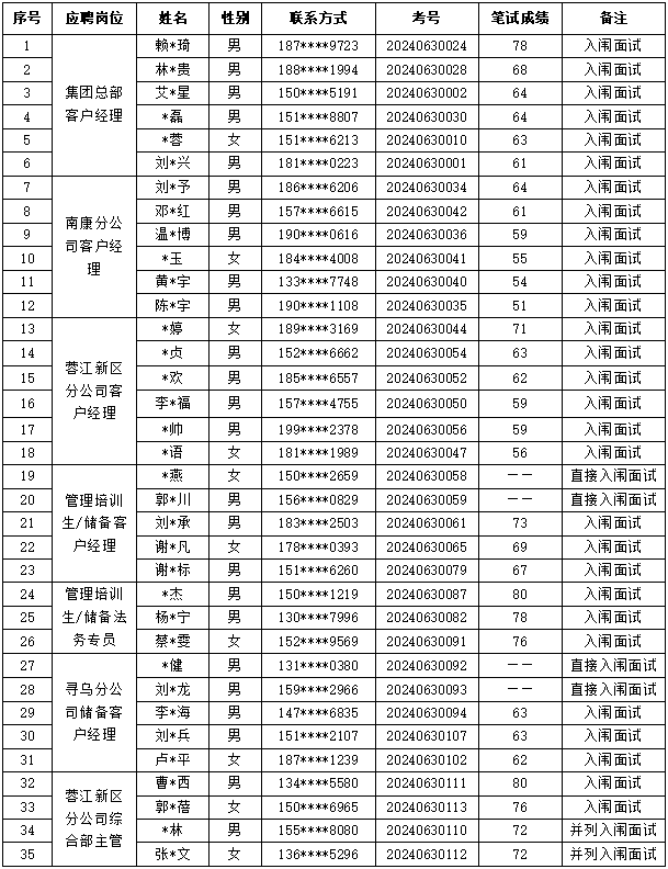 根據(jù)集團(tuán)公司招聘公告的相關(guān)規(guī)定和程序,經(jīng)過報(bào)名、資格審查、筆試等工作,現(xiàn)將本次招聘入闈面試人員名單(未達(dá)到面試條件的不另行通知)及有關(guān)事項(xiàng)公告如下: